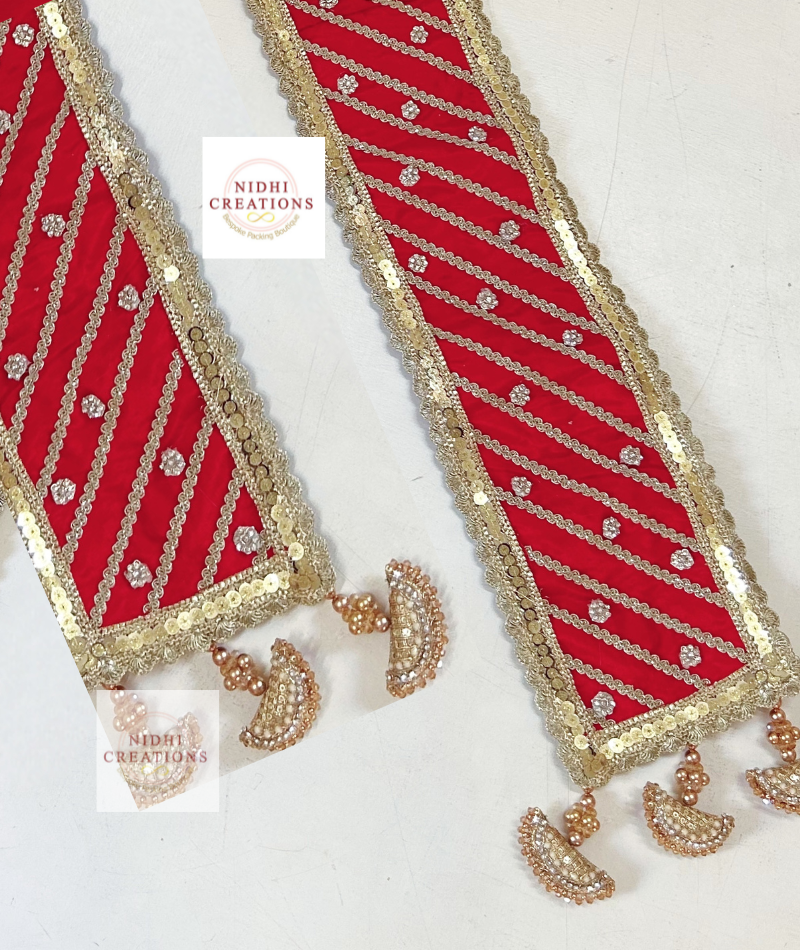 This gathjoda is crafted from intricately embroidered fabric, featuring the names of the bride and groom along with their wedding date within a decorative border.